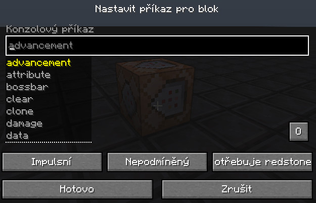 Dole pak vidíme 3 tlačítka, kterými se příkazový blok nastavuje. Ty si postupně ukážeme, ale zatím je necháme v základním nastavení.