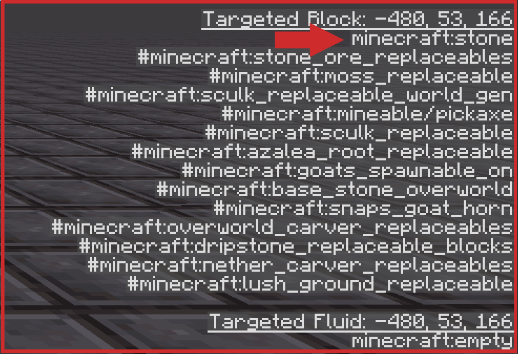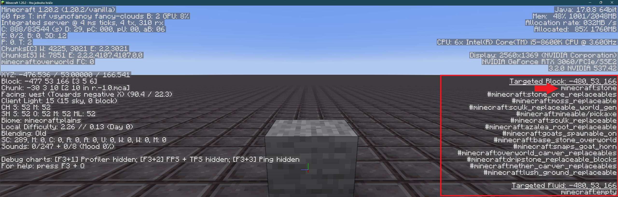 Pokud chceme zjistit ID bloku, který už je položený ve světě, tak si můžeme pomocí klávesy F3 zobrazit obrazovku s informacemi. Zobrazí se nám spoustu informací, textu a čísel. Tuto obrazovku budeme používat i na další věci, ale nyní se zaměříme na pravou část.