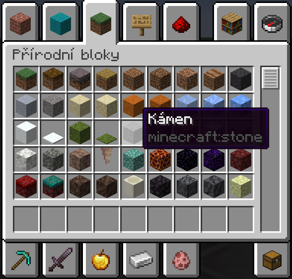 Tímto se označuje skupina předmětů. V základní verzi hry jsou všechny předměty označenyminecraft. Tato část pojmenování se používá například u modů a datapacků, které do hry mohou přidávat nové bloky. Protože nemáme do hry přidané žádné další předměty, tak můžeme tuto část vynechávat, ale v nápovědě se nám pořád bude zobrazovat. -