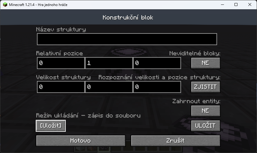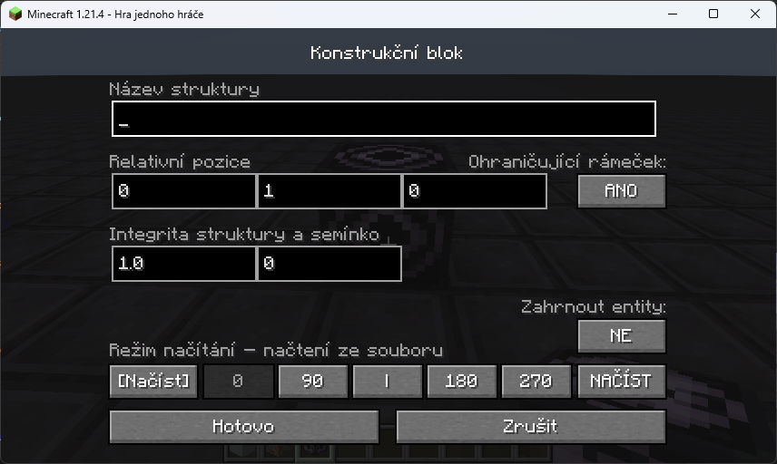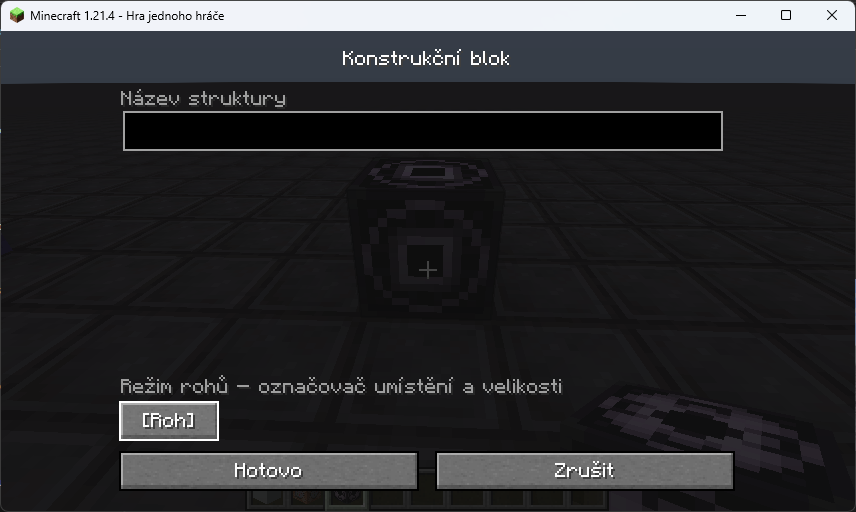 Konstrukční blok (Structure block) slouží ke kopírování oblasti podobně jako příkaz /clone. V porovnání s příkazem má tento blok spoustu dalších možností a především můžeme oblast vložit i do jiného světa nebo ji třeba sdílet s kamarády.