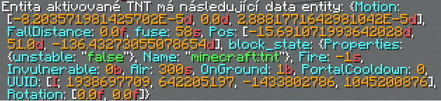 Zde vidíme data, která má například aktivované TNT. Nás bude zajímat vlastnost fuse - ta udává, za jak dlouho TNT vybouchne. Čas se v Minecraftu vždy udává v jednotce tick.